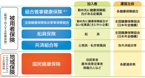 健康保険を運営する主体(「保険者」といいます)には、健康保険組合と全国健康保険協会(協会けんぽ)の2つがあります。